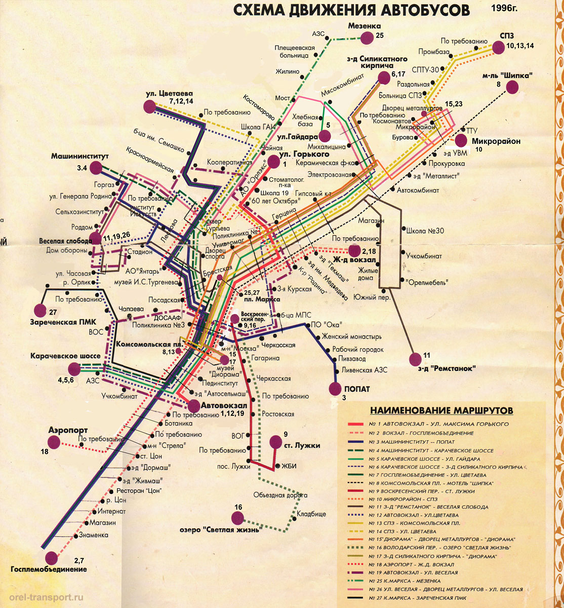 - Можно сказать - самый пик активной работы автобусов в Орле. Дальше шёл только спад и сокращение маршрутов. Что могу по ней добавить. Не помню в упор в конце 90-х 13 и 17 маршруты. №13 в какое-то время к 2000-м объявился в види экспресса на котором работал Икарус-260 по маршруту Комс.пл - Сев.рынок. По сути - работал как и КАВЗики. №17 не видел, но, вроде, он был (только маршрут: Вокзал - Силикатный). Хотя в том районе я в детстве бывал крайне редко и возможно просто не видел. В остальном - схема верная.